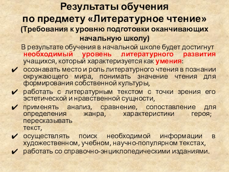 по предмету «Литературное чтение» (Требования к уровню подготовки оканчивающих начальную