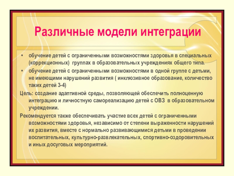 Рекомендуется также обеспечивать участие всех детей с ограниченными возможностями здоровья, независимо от степени выраженности нарушений их развития, вместе с нормально развивающимися детьми в проведении воспитательных, культурно-развлекательных, спортивно-оздоровительных и иных досуговых мероприятий.