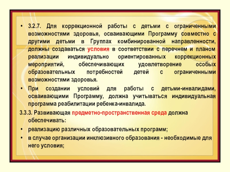 Программу совместно с другими детьми в Группах комбинированной направленности, должны создаваться условия в соответствии с перечнем и планом реализации индивидуально ориентированных коррекционных мероприятий, обеспечивающих удовлетворение особых образовательных потребностей детей с ограниченными возможностями здоровья.
