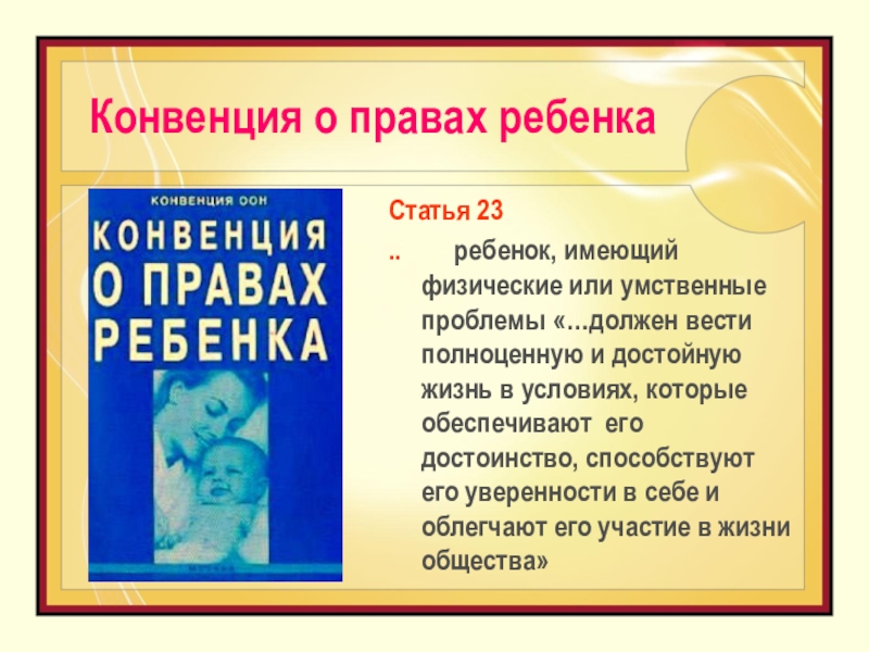 или умственные проблемы «…должен вести полноценную и достойную жизнь в условиях, которые обеспечивают его достоинство, способствуют его уверенности в себе и облегчают его участие в жизни общества»