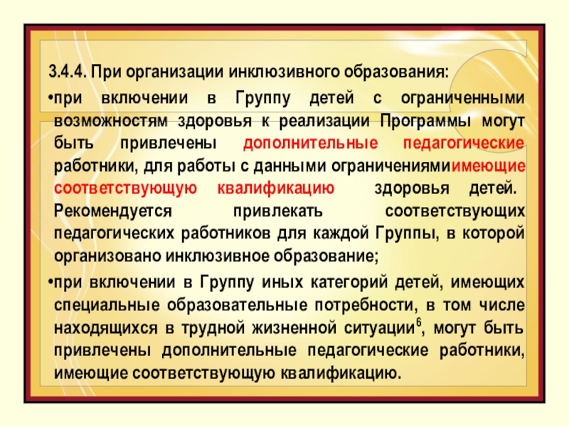при включении в Группу иных категорий детей, имеющих специальные образовательные потребности, в том числе находящихся в трудной жизненной ситуации6, могут быть привлечены дополнительные педагогические работники, имеющие соответствующую квалификацию.