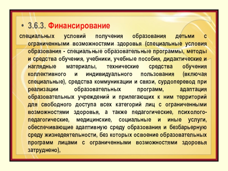 условия образования - специальные образовательные программы, методы и средства обучения, учебники, учебные пособия, дидактические и наглядные материалы, технические средства обучения коллективного и индивидуального пользования (включая специальные), средства коммуникации и связи, сурдоперевод при реализации образовательных программ, адаптация образовательных учреждений и прилегающих к ним территорий для свободного доступа всех категорий лиц с ограниченными возможностями здоровья, а также педагогические, психолого-педагогические, медицинские, социальные и иные услуги, обеспечивающие адаптивную среду образования и безбарьерную среду жизнедеятельности, без которых освоение образовательных программ лицами с ограниченными возможностями здоровья затруднено),