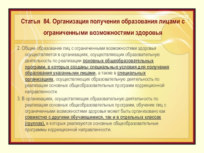 Слайд 19Статья 84. Организация получения образования лицами с ограниченными возможностями здоровья