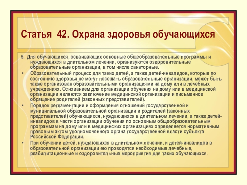Слайд 17Статья 42. Охрана здоровья обучающихся