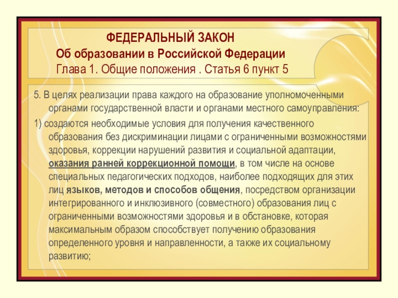 6. В целях обеспечения реализации права на образование обучающихся с ограниченными возможностями здоровья в федеральные государственные образовательные стандарты включаются специальные требования и (или) устанавливаются специальные федеральные государственные образовательные стандарты.