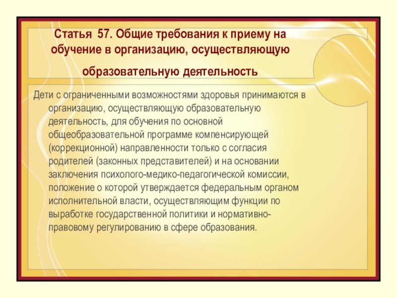Слайд 18Статья 57. Общие требования к приему на обучение в организацию, осуществляющую образовательную