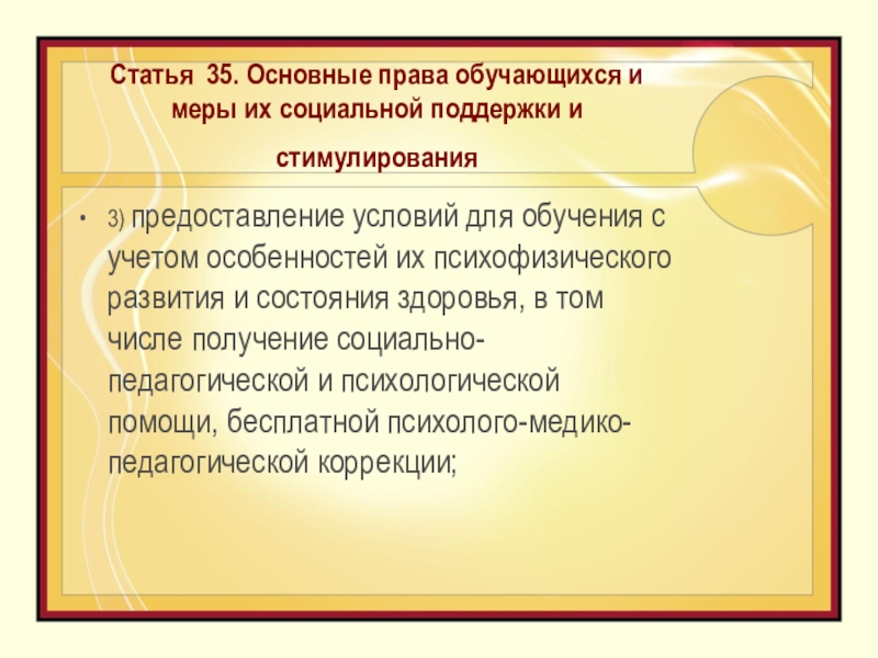 Слайд 16Статья 35. Основные права обучающихся и меры их социальной поддержки и стимулирования