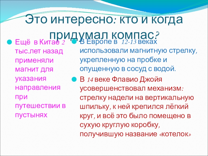 В Европе в 12-13 веках использовали магнитную стрелку, укрепленную на пробке и опущенную в сосуд с водой.