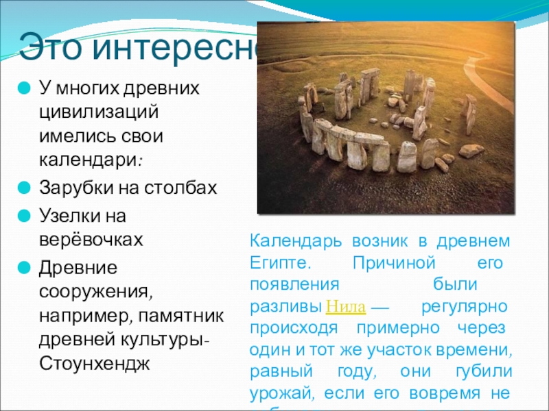 Календарь возник в древнем Египте. Причиной его появления были разливы Нила — регулярно происходя примерно через один и тот же участок времени, равный году, они губили урожай, если его вовремя не собирали, и приносили плодородную землю после разлива. Человеку требовалось этот промежуток времени рассчитать, иначе он не смог бы себя прокормить.