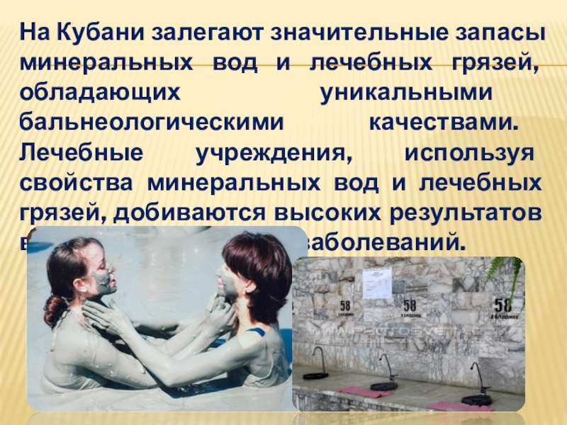 Слайд 7На Кубани залегают значительные запасы минеральных вод и лечебных грязей, обладающих