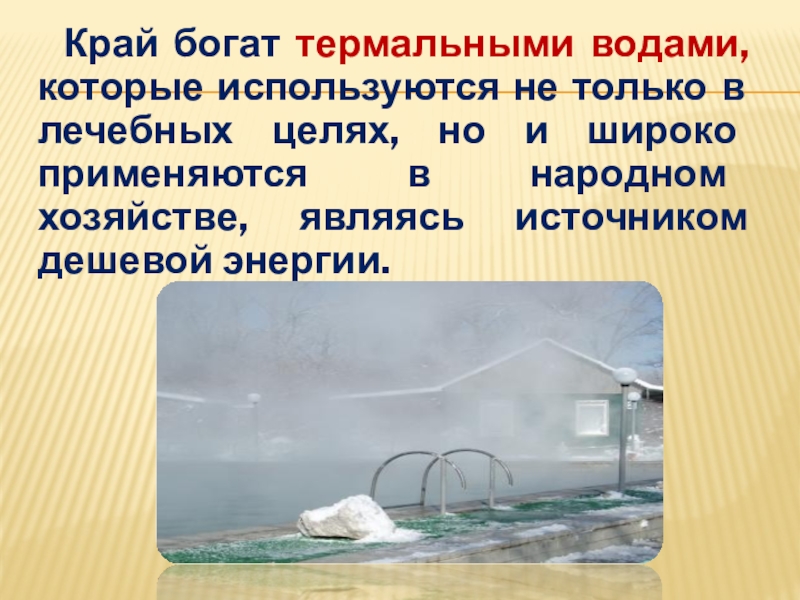 Слайд 11 Край богат термальными водами, которые используются не только в