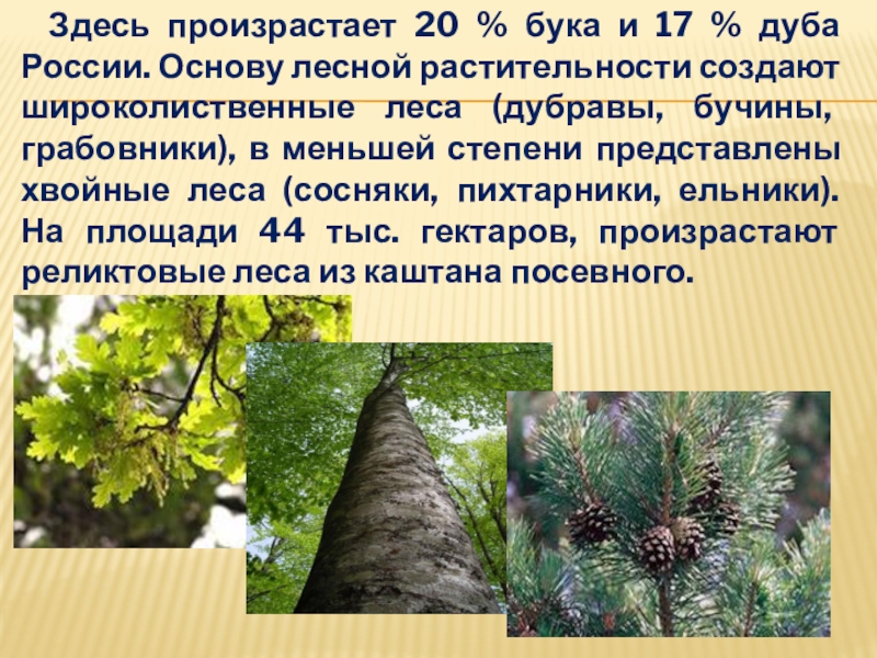 России. Основу лесной растительности создают широколиственные леса (дубравы, бучины, грабовники), в меньшей степени представлены хвойные леса (сосняки, пихтарники, ельники). На площади 44 тыс. гектаров, произрастают реликтовые леса из каштана посевного.