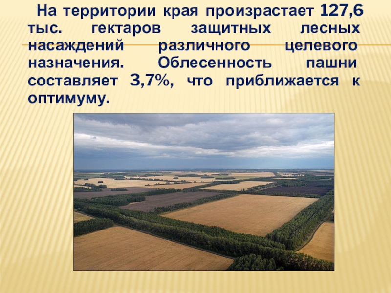 Слайд 14 На территории края произрастает 127,6 тыс. гектаров защитных лесных