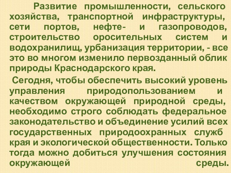 нефте- и газопроводов, строительство оросительных систем и водохранилищ, урбанизация территории, - все это во многом изменило первозданный облик природы Краснодарского края.
