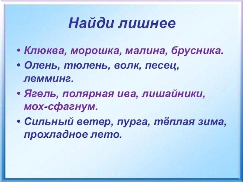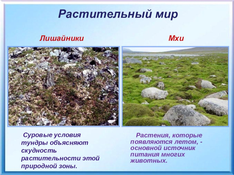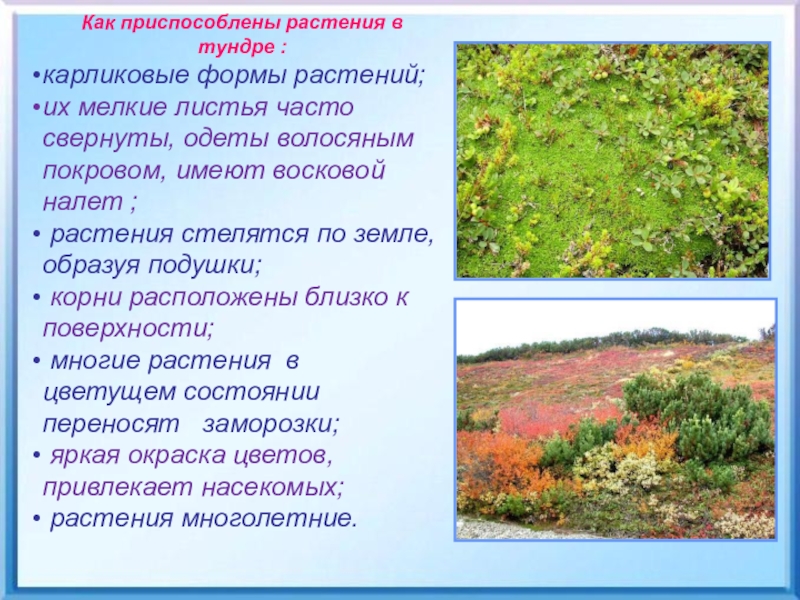 Суровые условия тундры объясняют скудность растительности этой природной зоны.