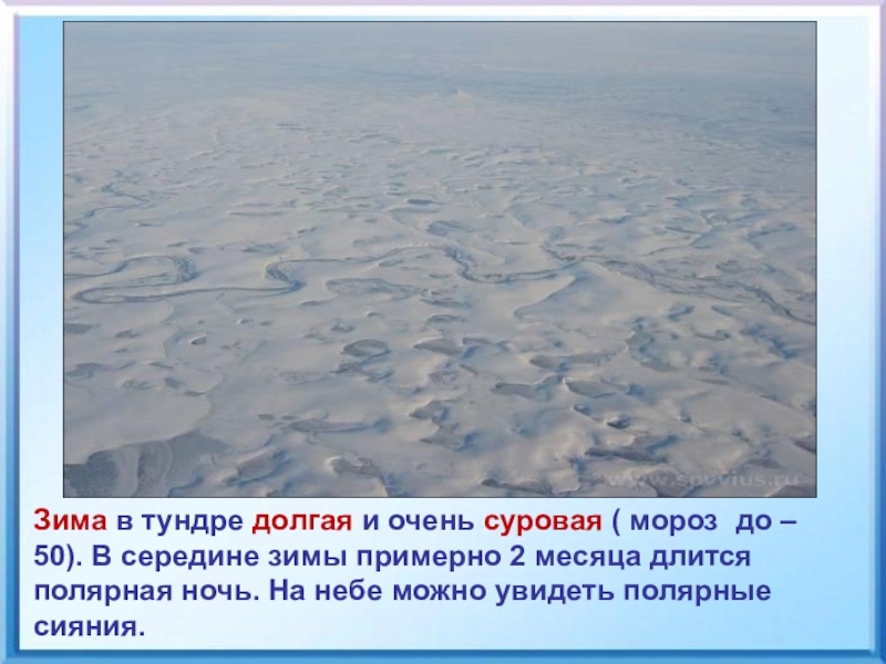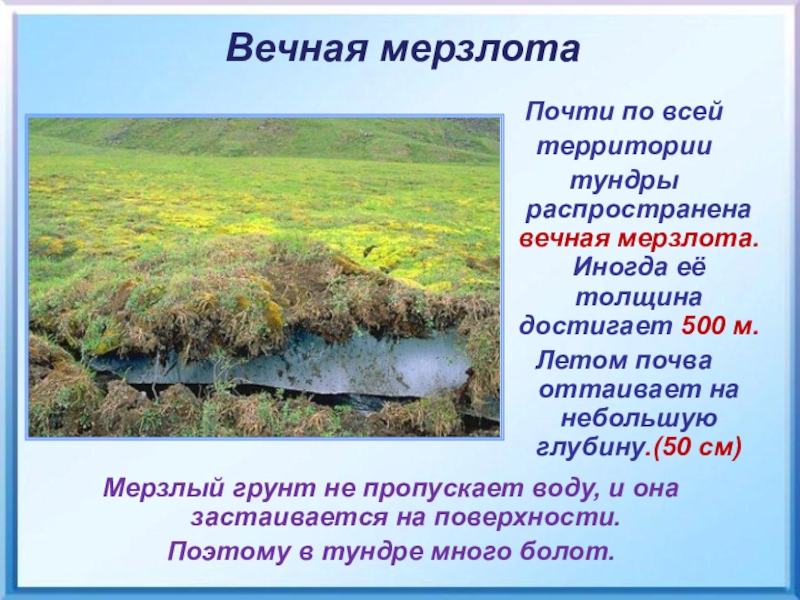 тундры распространена вечная мерзлота. Иногда её толщина достигает 500 м.