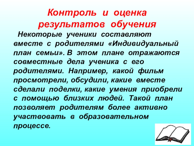 «Индивидуальный план семьи». В этом плане отражаются совместные дела ученика с его родителями. Например, какой фильм просмотрели, обсудили, какие вместе сделали поделки, какие умения приобрели с помощью близких людей. Такой план позволяет родителям более активно участвовать в образовательном процессе.