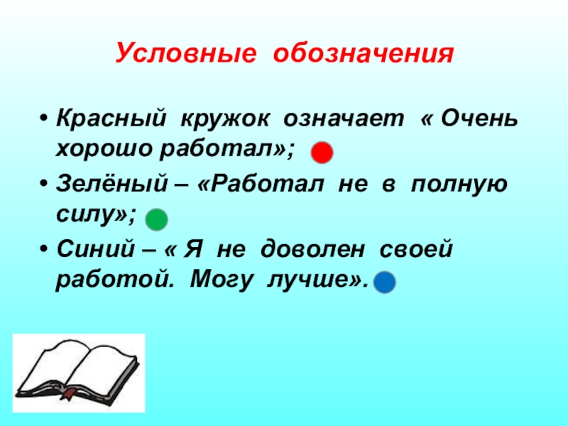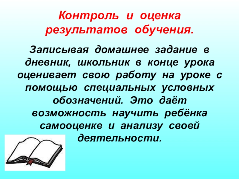конце урока оценивает свою работу на уроке с помощью специальных условных обозначений. Это даёт возможность научить ребёнка самооценке и анализу своей деятельности.