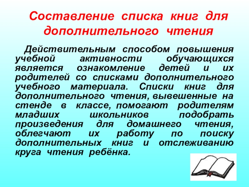активности обучающихся является ознакомление детей и их родителей со списками дополнительного учебного материала. Списки книг для дополнительного чтения, вывешенные на стенде в классе, помогают родителям младших школьников подобрать произведения для домашнего чтения, облегчают их работу по поиску дополнительных книг и отслеживанию круга чтения ребёнка.