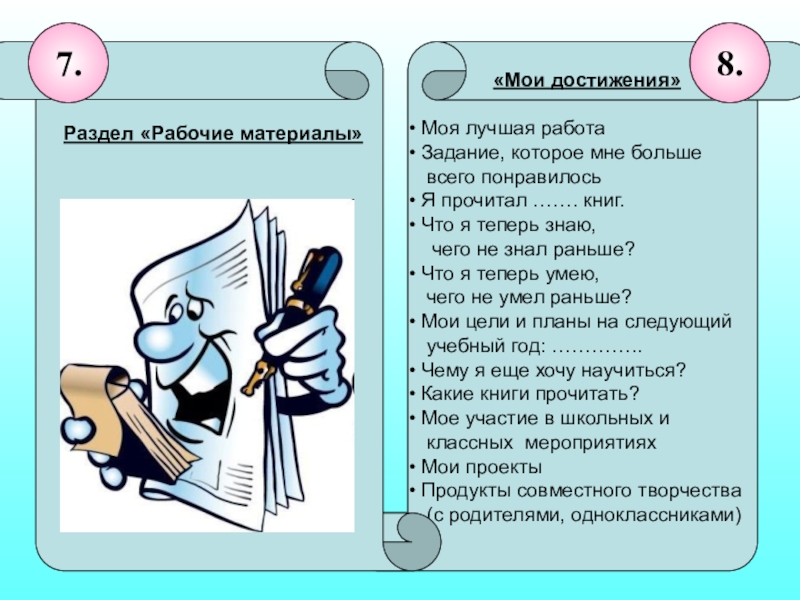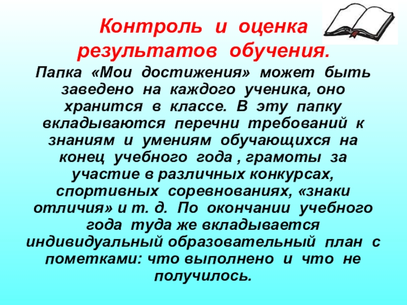 каждого ученика, оно хранится в классе. В эту папку вкладываются перечни требований к знаниям и умениям обучающихся на конец учебного года , грамоты за участие в различных конкурсах, спортивных соревнованиях, «знаки отличия» и т. д. По окончании учебного года туда же вкладывается индивидуальный образовательный план с пометками: что выполнено и что не получилось.