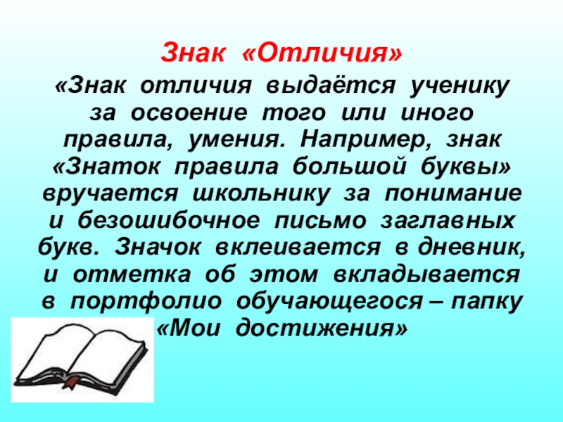 умения. Например, знак «Знаток правила большой буквы» вручается школьнику за понимание и безошибочное письмо заглавных букв. Значок вклеивается в дневник, и отметка об этом вкладывается в портфолио обучающегося – папку «Мои достижения»