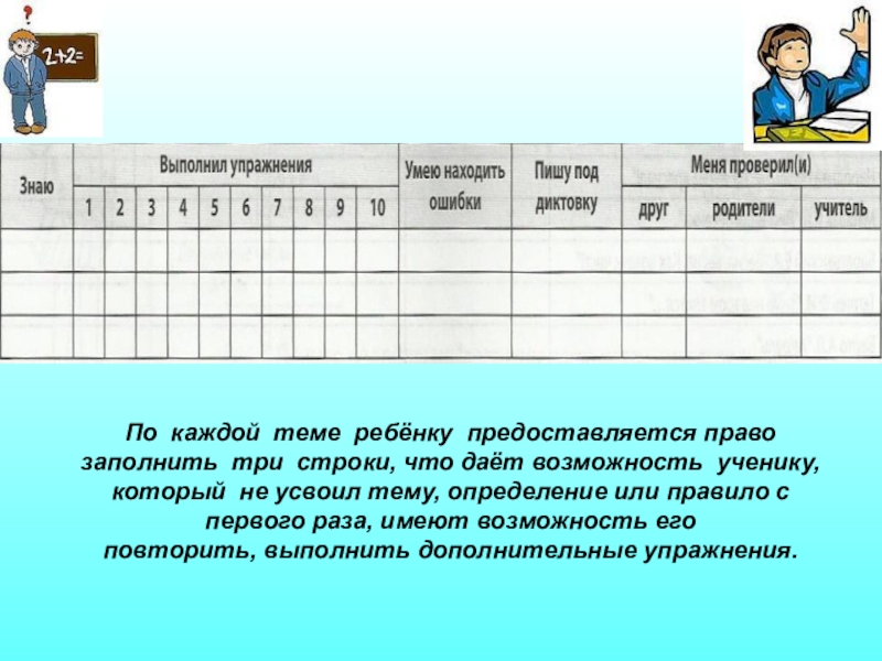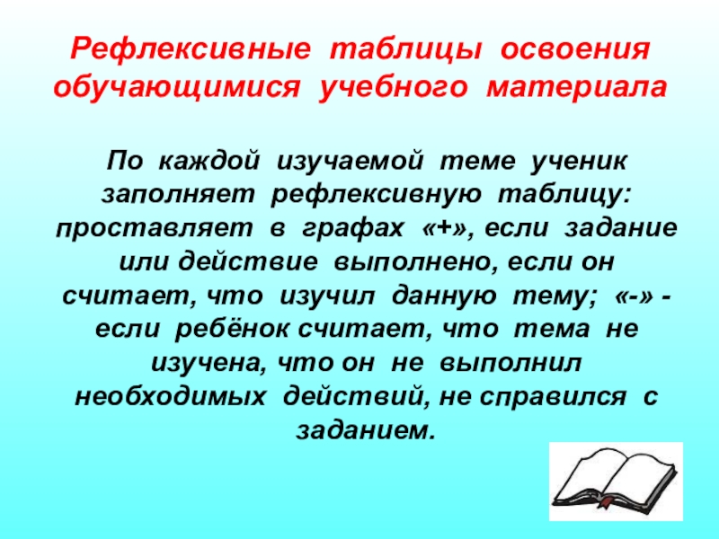 рефлексивную таблицу: проставляет в графах «+», если задание или действие выполнено, если он считает, что изучил данную тему; «-» - если ребёнок считает, что тема не изучена, что он не выполнил необходимых действий, не справился с заданием.