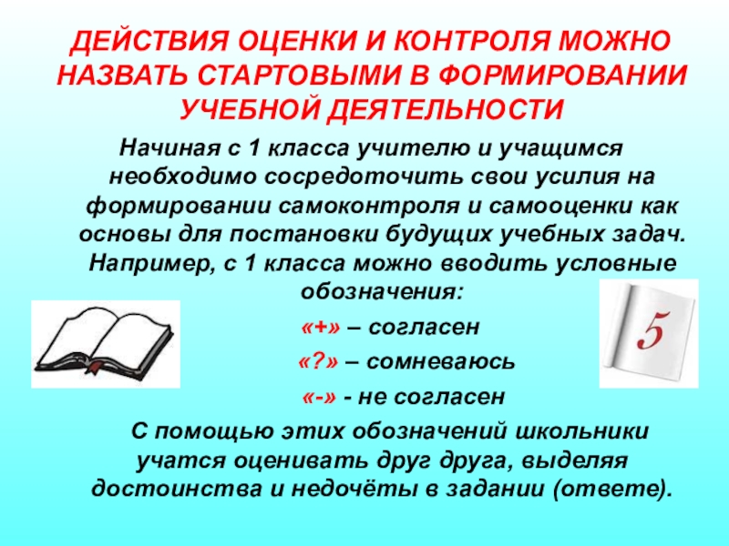 Слайд 5ДЕЙСТВИЯ ОЦЕНКИ И КОНТРОЛЯ МОЖНО НАЗВАТЬ СТАРТОВЫМИ В ФОРМИРОВАНИИ УЧЕБНОЙ ДЕЯТЕЛЬНОСТИ