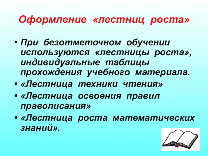 При безотметочном обучении используются «лестницы роста», индивидуальные таблицы прохождения