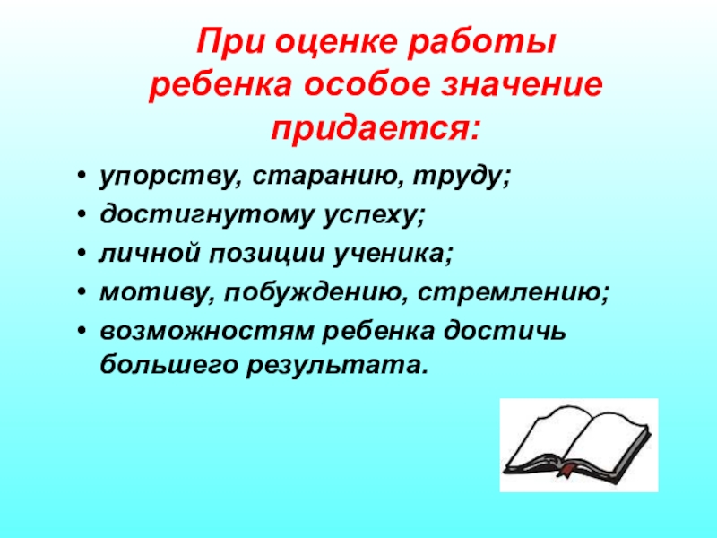 При оценке работы ребенка особое значение придается: