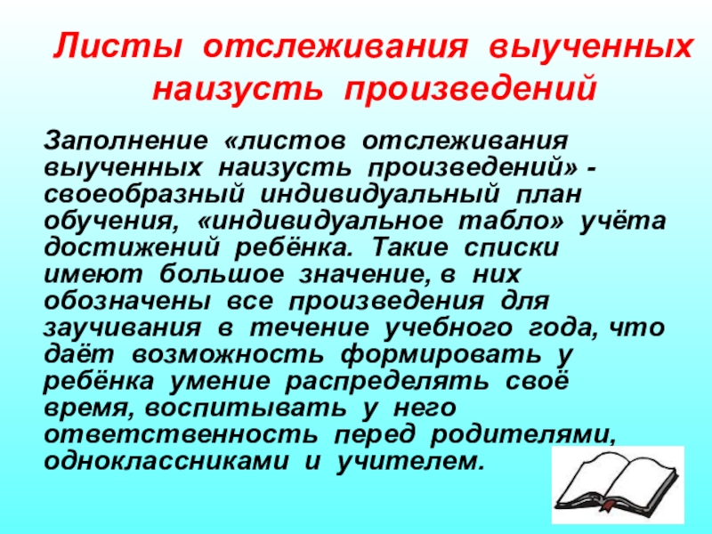 своеобразный индивидуальный план обучения, «индивидуальное табло» учёта достижений ребёнка. Такие списки имеют большое значение, в них обозначены все произведения для заучивания в течение учебного года, что даёт возможность формировать у ребёнка умение распределять своё время, воспитывать у него ответственность перед родителями, одноклассниками и учителем.