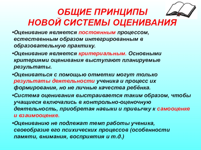 Оцениванию не подлежат темп работы ученика, своеобразие его психических процессов (особенности памяти, внимания, восприятия и т.д.)