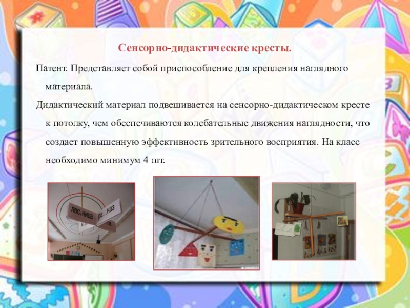подвешивается на сенсорно-дидактическом кресте к потолку, чем обеспечиваются колебательные движения наглядности, что создает повышенную эффективность зрительного восприятия. На класс необходимо минимум 4 шт.