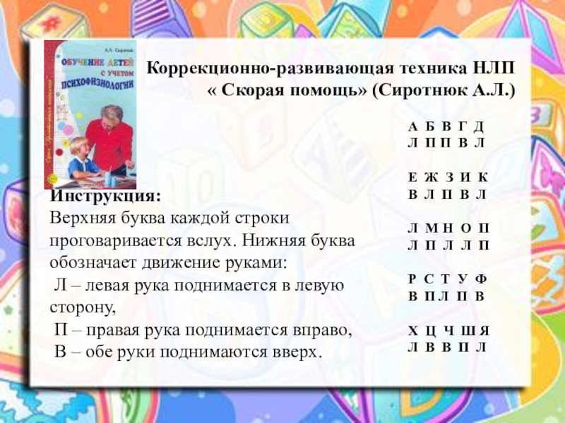 Верхняя буква каждой строки проговаривается вслух. Нижняя буква обозначает движение руками: