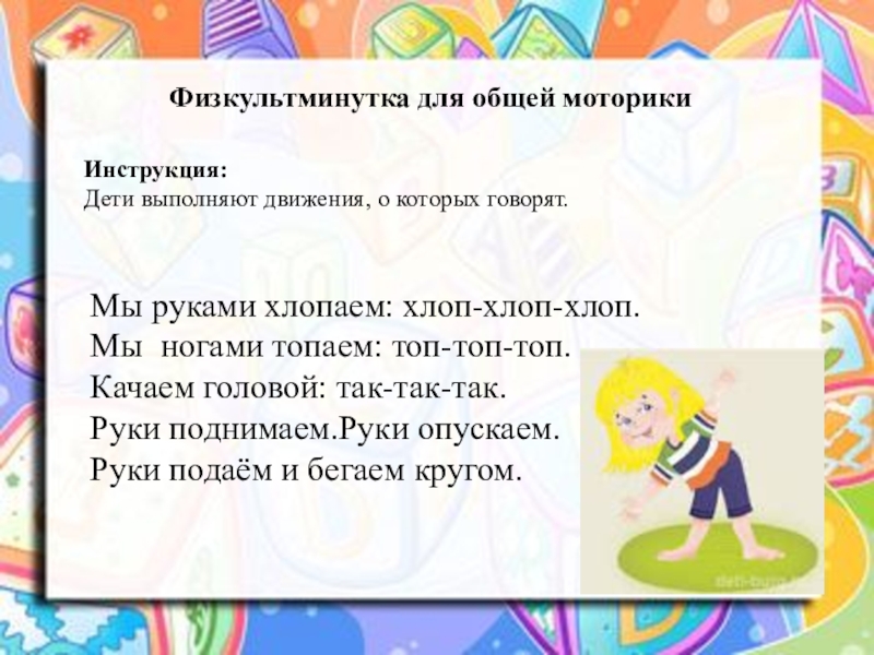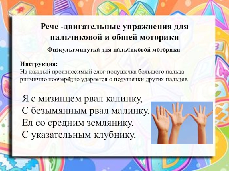 Слайд 11Рече -двигательные упражнения для пальчиковой и общей моторики