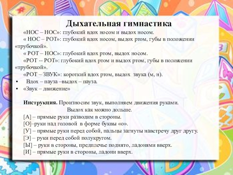 « НОС – РОТ»: глубокий вдох носом, выдох ртом, губы в положении «трубочкой».