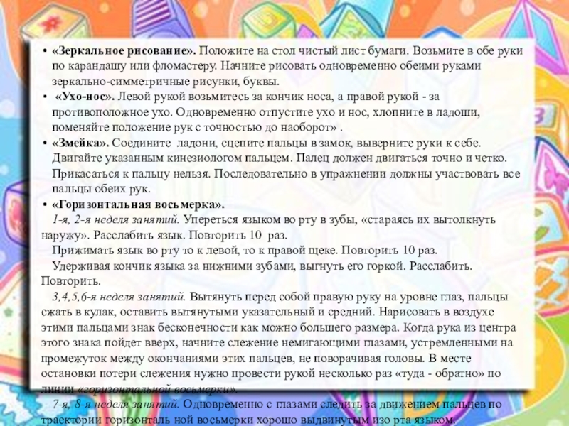 7-я, 8-я неделя занятий. Одновременно с глазами следить за движением пальцев по траектории горизонталь ной восьмерки хорошо выдвинутым изо рта языком.