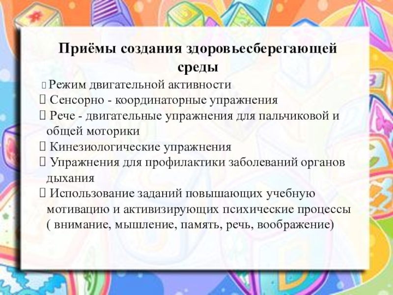 Слайд 3Приёмы создания здоровьесберегающей среды