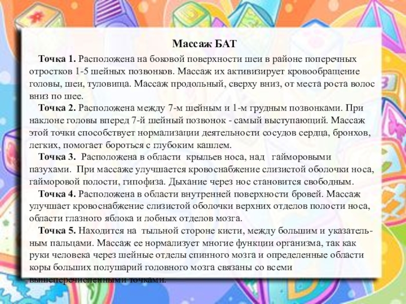 отростков 1-5 шейных позвонков. Массаж их активизирует кровообращение головы, шеи, туловища. Массаж продольный, сверху вниз, от места роста волос вниз по шее.