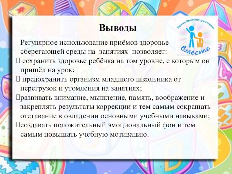 Регулярное использование приёмов здоровье сберегающей среды на занятиях позволяет: