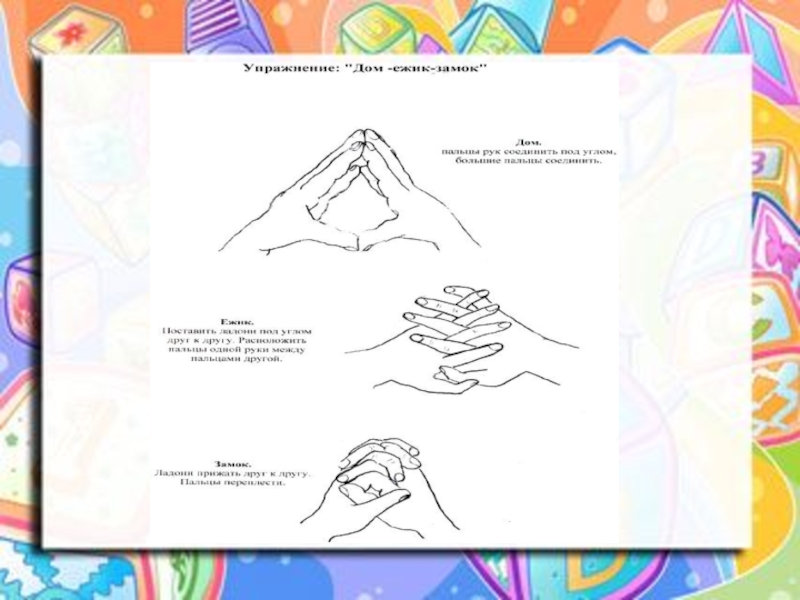 «Кулак-ребро-ладонь». Ребенку показывают три положения руки на плоскости стола, последовательно сменяющих друг друга. Ладонь на плоскости; ладонь, сжатая в кулак; ладонь ребром на плоскости стола; распрямлённая ладонь на плоскости стола. Ребенок выполняет пробу вместе с педагогом, затем по памяти в течение 8-10 повторений моторной программы. Проба выполняется сначала правой рукой, затем - левой, затем - двумя руками вместе.