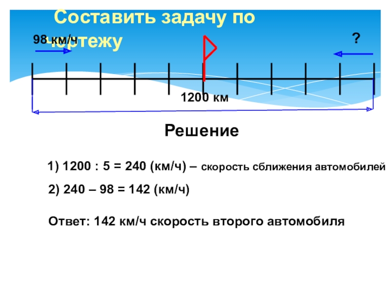 1) 1200 : 5 = 240 (км/ч) – скорость сближения автомобилей