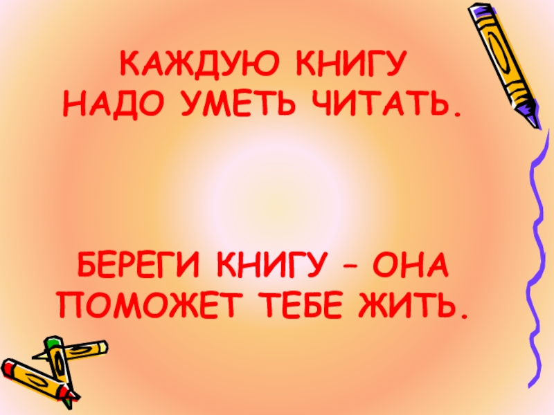 Слайд 10 КАЖДУЮ КНИГУ НАДО УМЕТЬ ЧИТАТЬ. БЕРЕГИ КНИГУ – ОНА ПОМОЖЕТ ТЕБЕ ЖИТЬ.