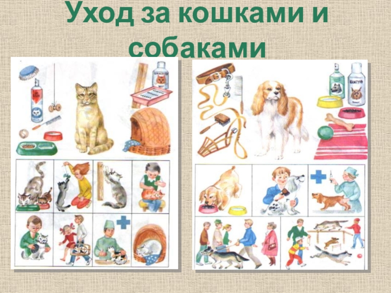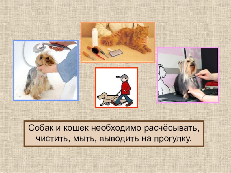 Собак и кошек необходимо расчёсывать,чистить, мыть, выводить на прогулку.