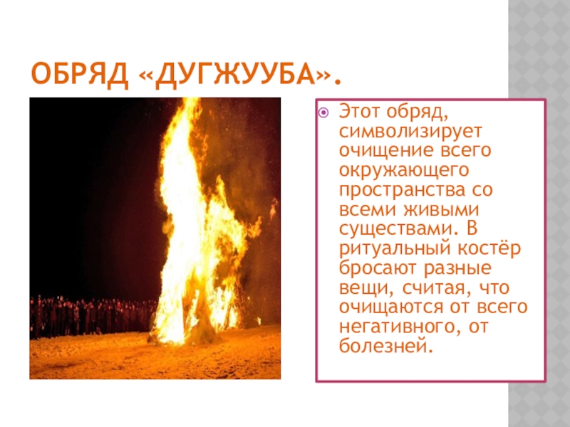 существами. В ритуальный костёр бросают разные вещи, считая, что очищаются от всего негативного, от болезней.