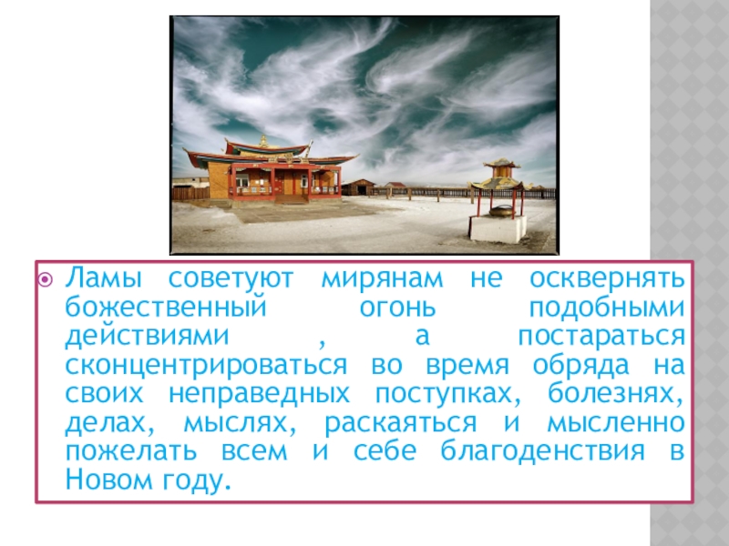 Слайд 6Ламы советуют мирянам не осквернять божественный огонь подобными действиями , а