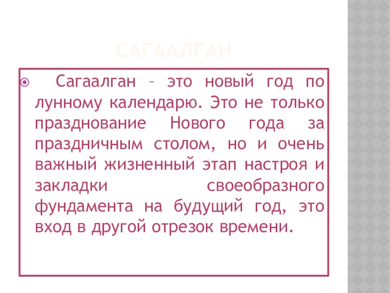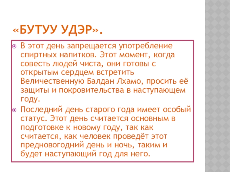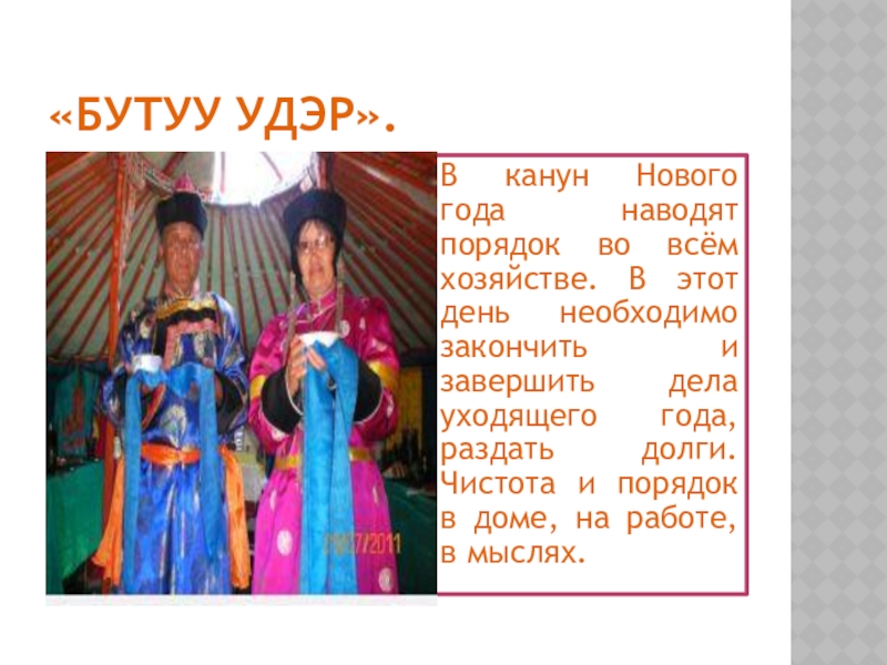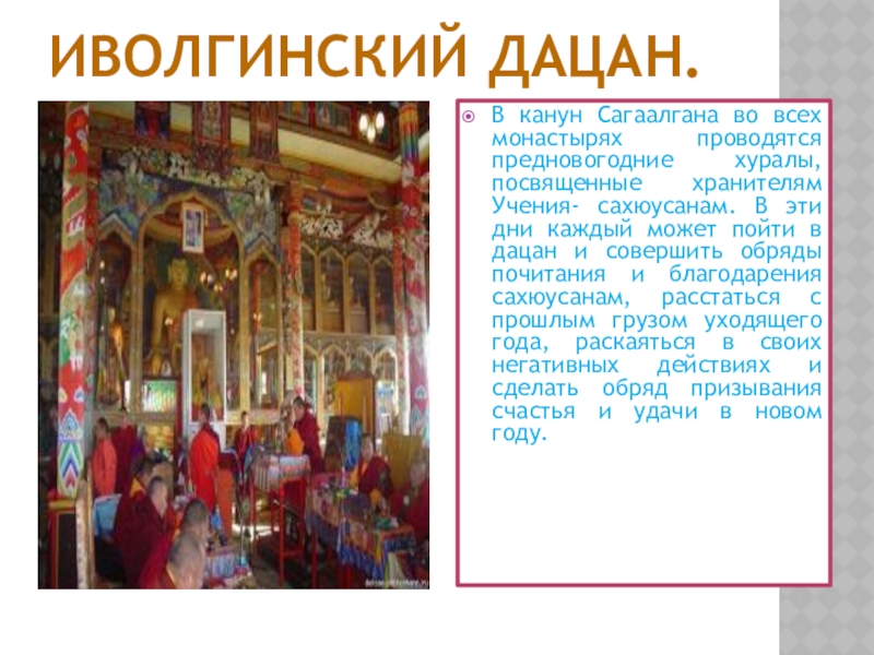 хранителям Учения- сахюусанам. В эти дни каждый может пойти в дацан и совершить обряды почитания и благодарения сахюусанам, расстаться с прошлым грузом уходящего года, раскаяться в своих негативных действиях и сделать обряд призывания счастья и удачи в новом году.