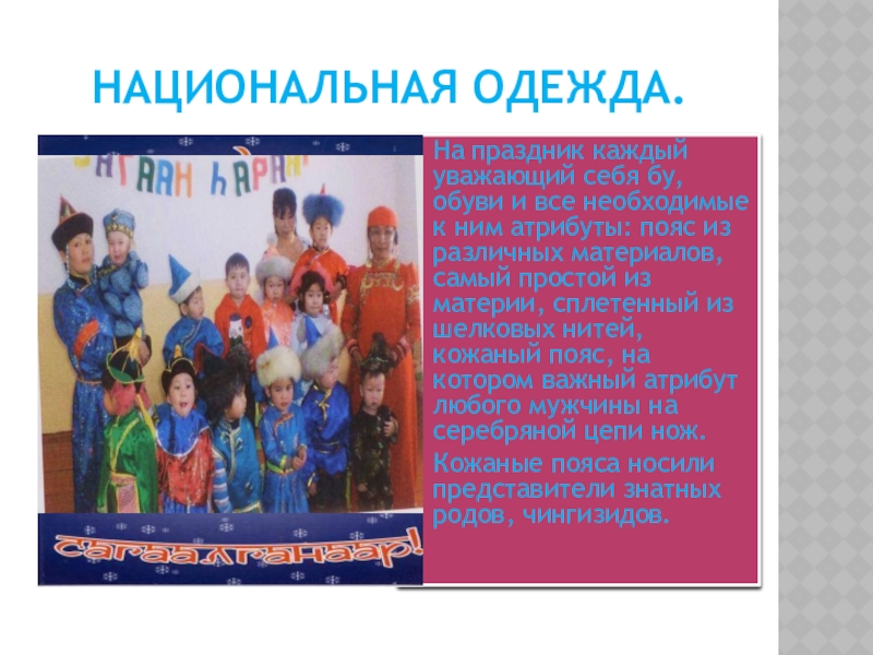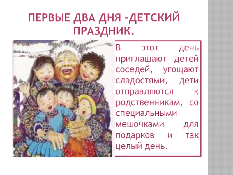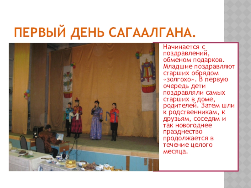 «золгохо». В первую очередь дети поздравляли самых старших в доме, родителей. Затем шли к родственникам, к друзьям, соседям и так новогоднее празднество продолжается в течение целого месяца.