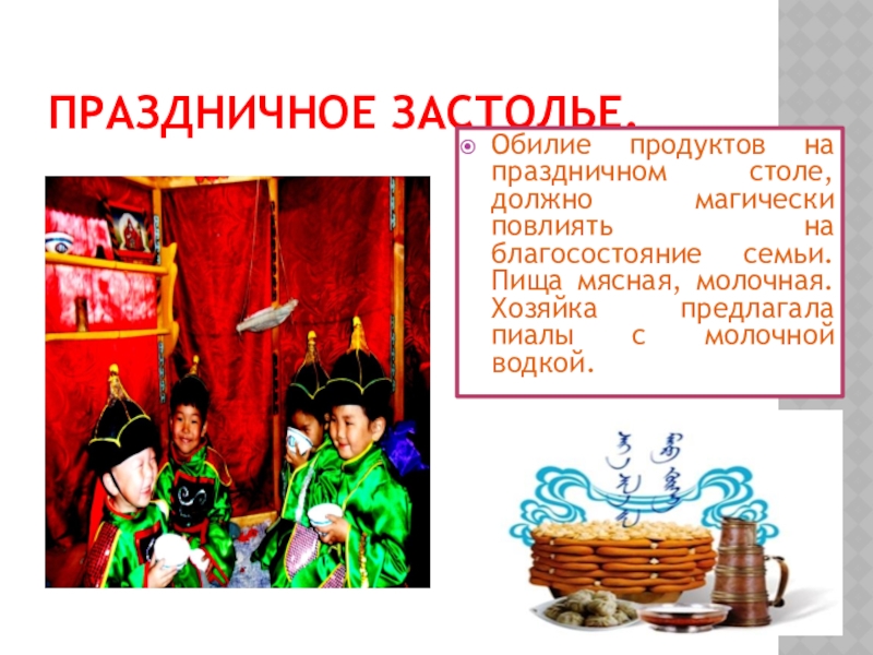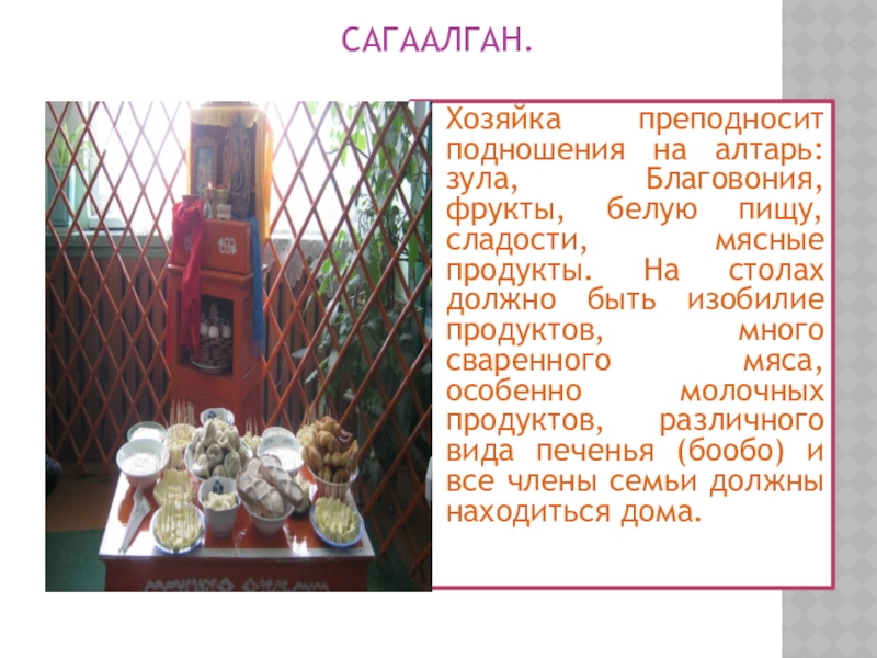 мясные продукты. На столах должно быть изобилие продуктов, много сваренного мяса, особенно молочных продуктов, различного вида печенья (бообо) и все члены семьи должны находиться дома.