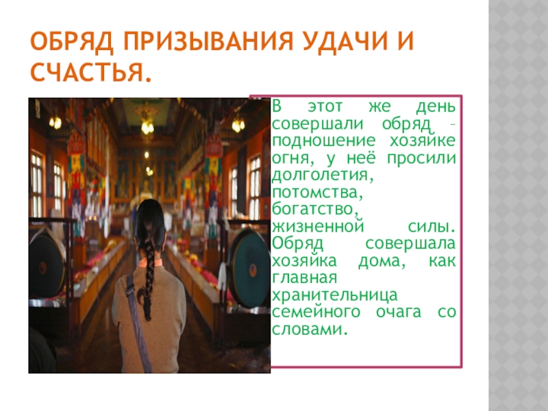 подношение хозяйке огня, у неё просили долголетия, потомства, богатство, жизненной силы. Обряд совершала хозяйка дома, как главная хранительница семейного очага со словами.