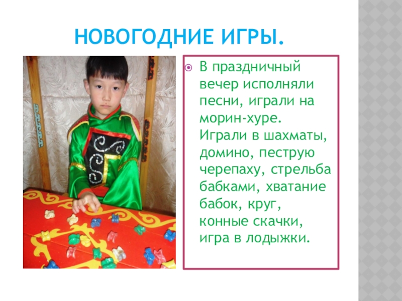 шахматы, домино, пеструю черепаху, стрельба бабками, хватание бабок, круг, конные скачки, игра в лодыжки.